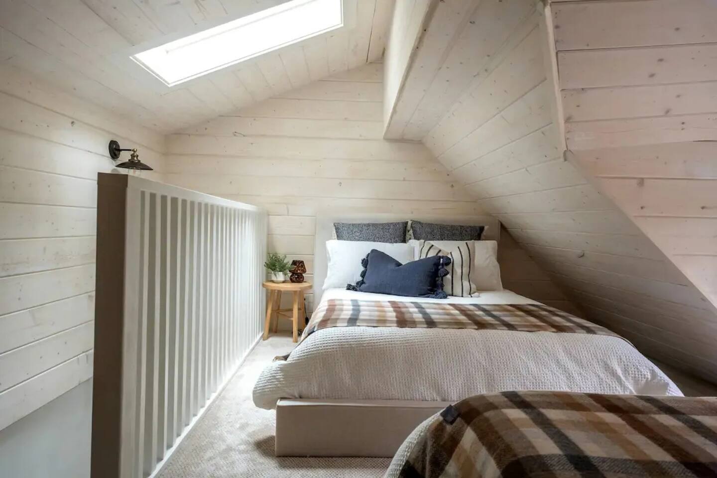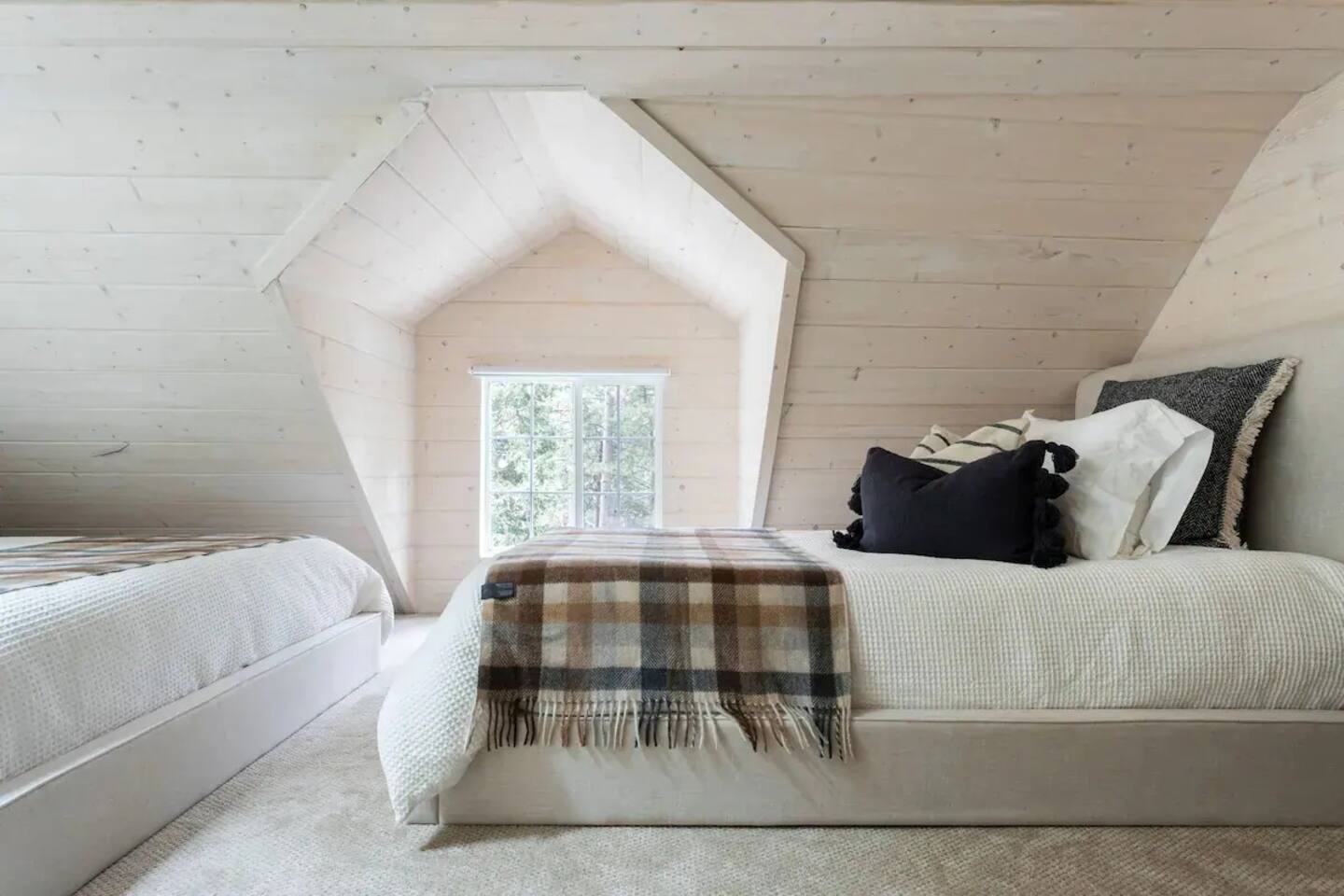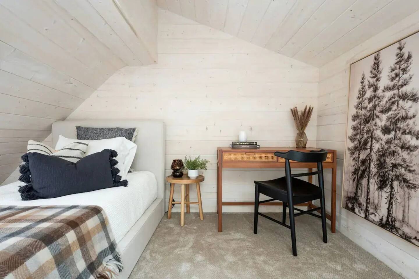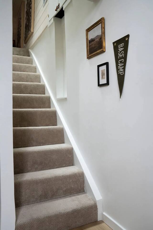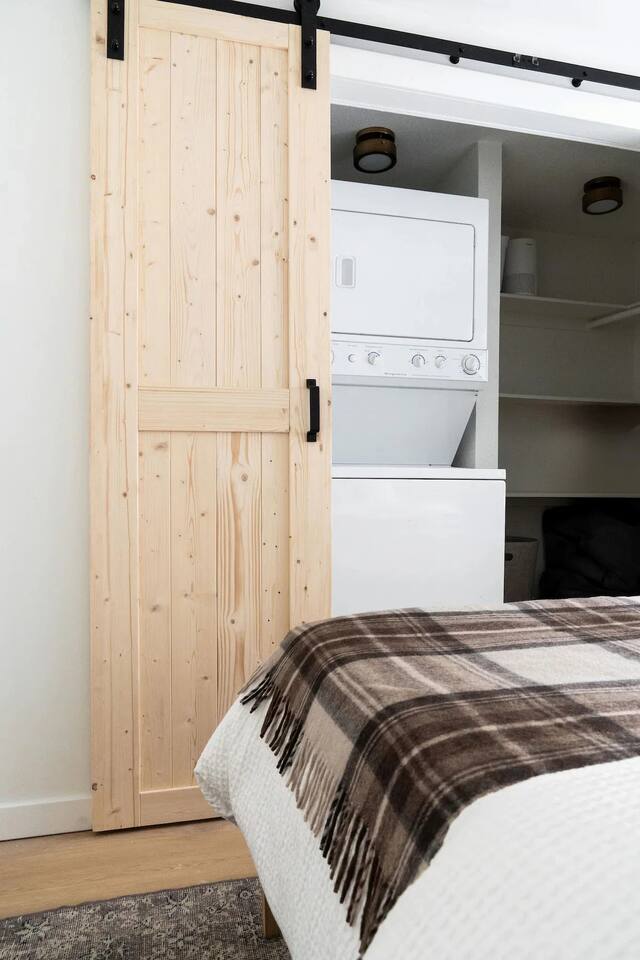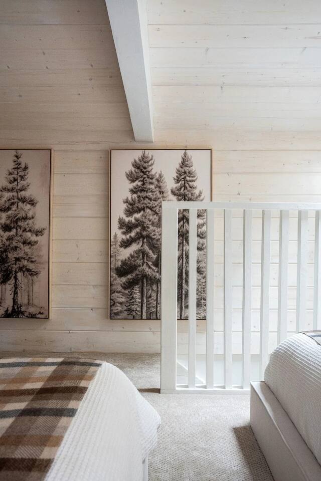 The home was fully renovated in 2023 and designed to be a dreamy mountain oasis. It sleeps 4-5 people comfortably and is ideal for couples or a small family. PARKING: Driveway parking is for one car ONLY. Please let us know if you need to bring an additional vehicle and we may be able to accommodate. BEDROOM 1: The main level bedroom features a luxurious queen size bed with a memory foam mattress. The closet contains plenty of shelving and hangers along with a washer/dryer. BEDROOM 2: The upstairs loft bedroom features one full-size bed and one twin bed. Both mattresses are memory foam for your ultimate comfort. There is a skylight above the full bed for star gazing and waking up to a view of the towering pine trees. There is also a desk in this space for your work-from-home needs. KITCHEN: Updated appliances and everything you need to cook a great meal. There is a Keurig coffee maker, French press and electric kettle for coffee or tea. Coffee pods, tea bags, olive oil, salt and pepper provided. LIVING ROOM: Featuring a cozy gas fireplace, a Smart TV with all your favorite apps, Sonos sound system, Crosley record player with a collection of vintage vinyl records and plenty of board games to keep the entire family entertained. BATHROOM: Main level bathroom has been renovated with an eye-catching design, Shower essentials are provided (shampoo, conditioner and body wash). FRONT DECK: Features a propane BBQ for your grilling needs, a bistro table and plenty of seating around a gas fire pit for relaxing under the stars and string lights. PET FRIENDLY: One (1) well behaved and house trained dog is permitted but they must be added to the reservation. Please bring all pet supplies and kindly clean up after them. We ask that your fur baby stays off the furniture, but if they must come up please bring a blanket or use our provided pet blanket. Please do not leave the dog unattended at the cabin at any time (unless crated). Sorry, no cats.