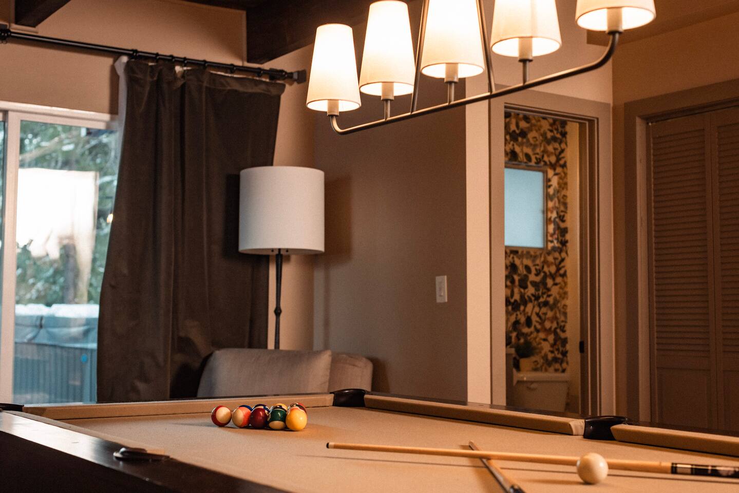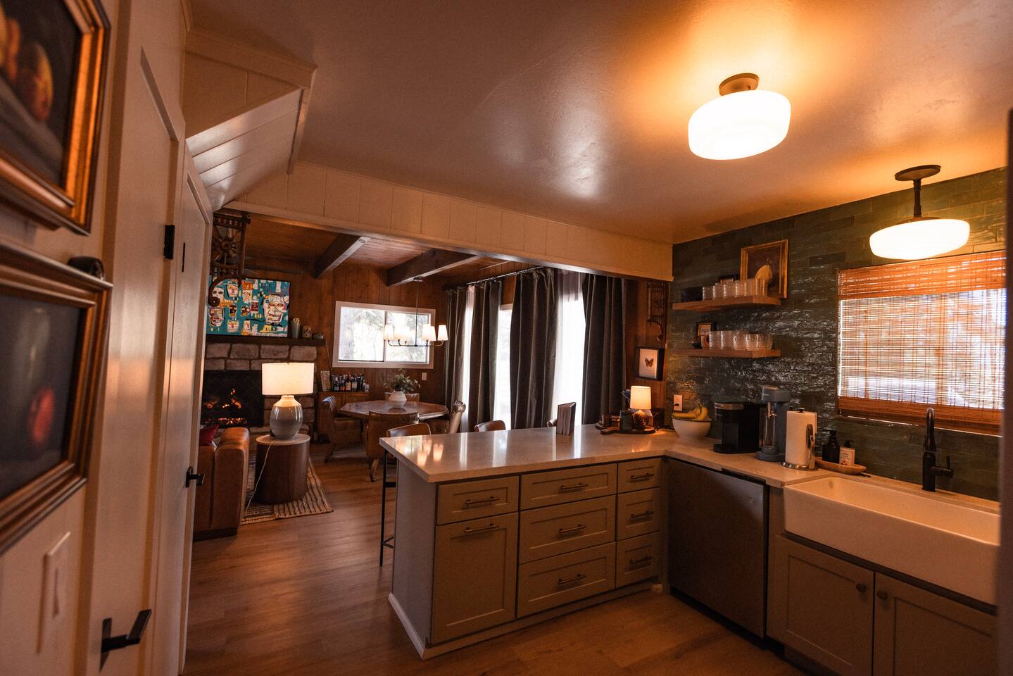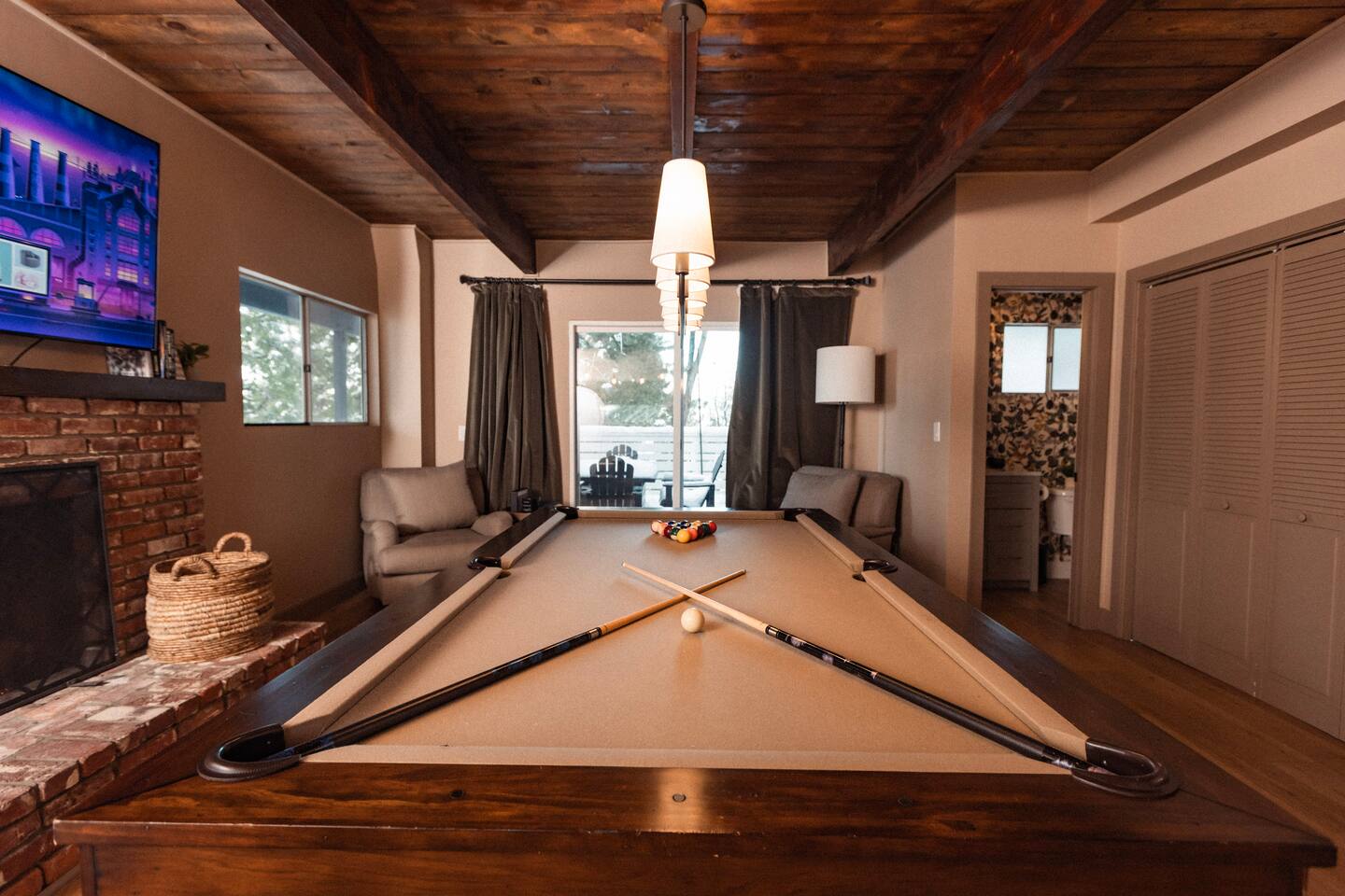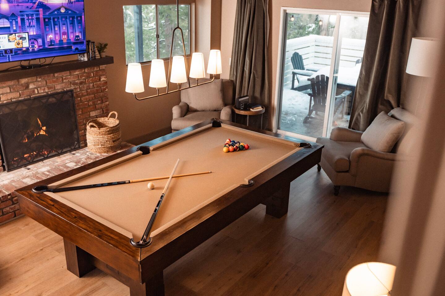 LAYOUT: Please note that this cabin does require you to climb stairs, both exterior & interior. The home itself is three levels. LOWER LEVEL: A cozy den with a brick-hearth gas fireplace and a pool table for late-night games. The hot tub is located on the patio off of the game room. MAIN FLOOR: A modern kitchen opens into the living and dining areas, complete with a second gas fireplace. There is also a bedroom and bath on this level. UPPER LEVEL: Features two additional King bedrooms with vaulted ceilings and a desk setup where squirrels might pause to see if you’re working or daydreaming. PET-FRIENDLY: We allow up to 2 well-behaved, house trained dogs but they MUST be listed in the reservation guest count. Dogs must never be left at the home unattended, unless crated. LAKE ACCESS: This home features exclusive access to the trails around Lake Arrowhead. Please refer to our house manual upon booking for more access info. This is a quiet getaway, not a party house. Sound travels easily in the mountains, and we’re very strict about noise. There are other homes nearby better suited for gatherings, but ours isn’t one of them. If you’re looking for a peaceful retreat, this is the perfect spot! Per San Bernardino county rules, you must be 21+ to book.