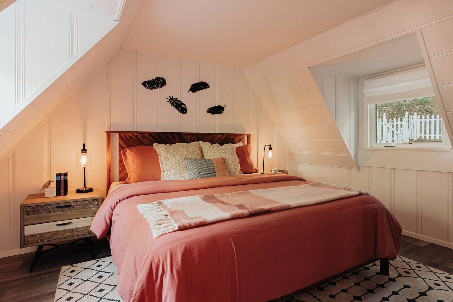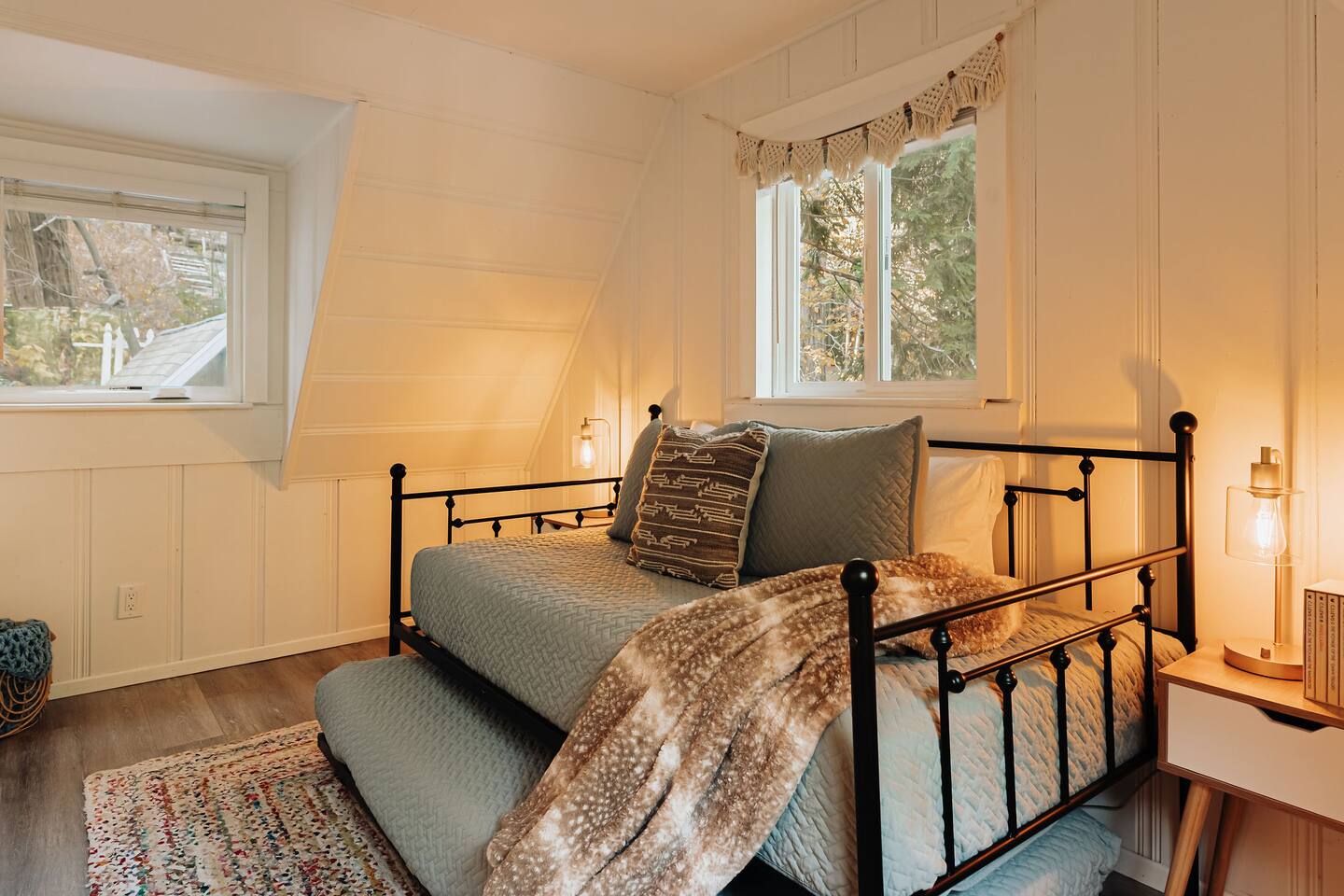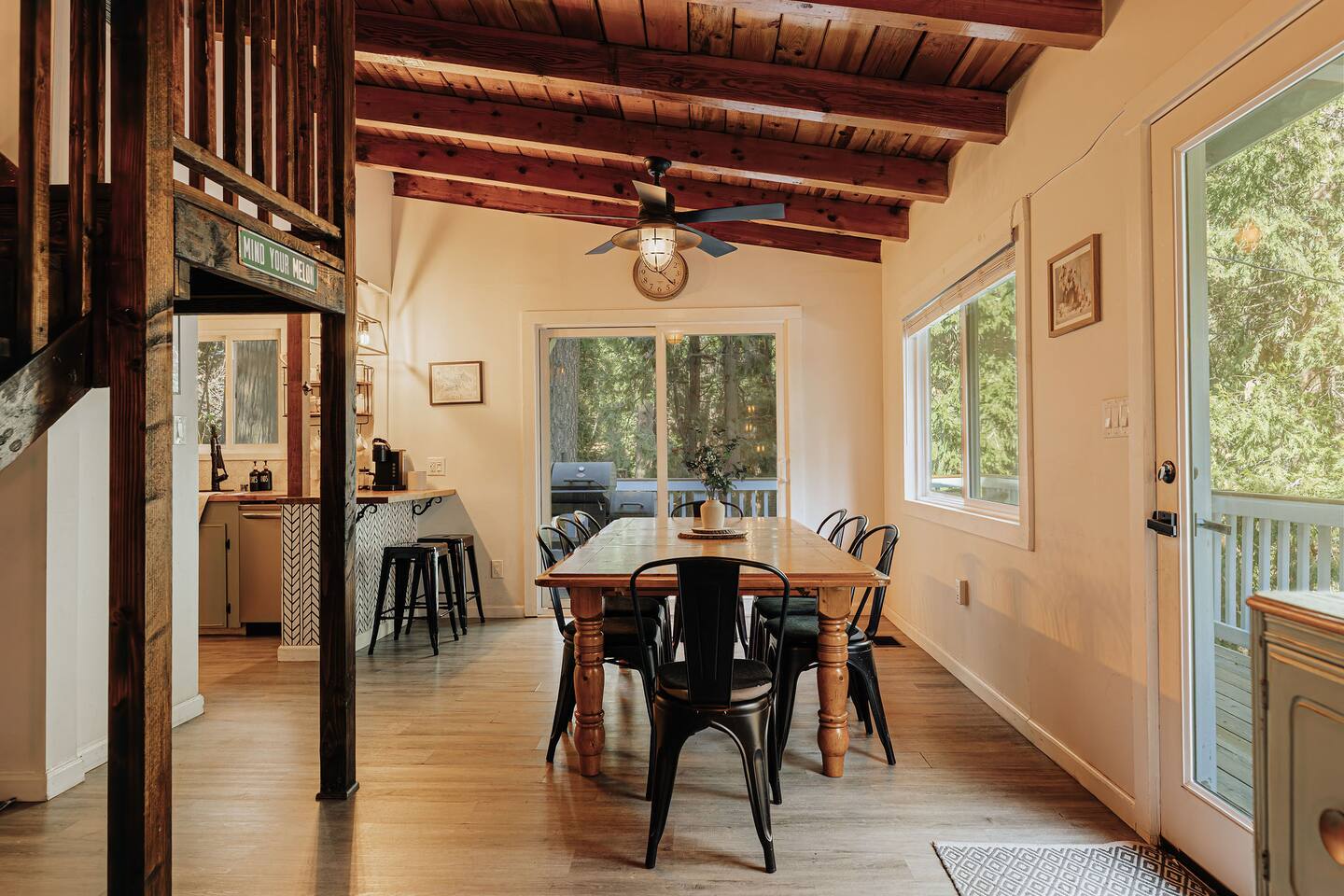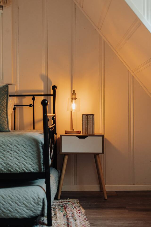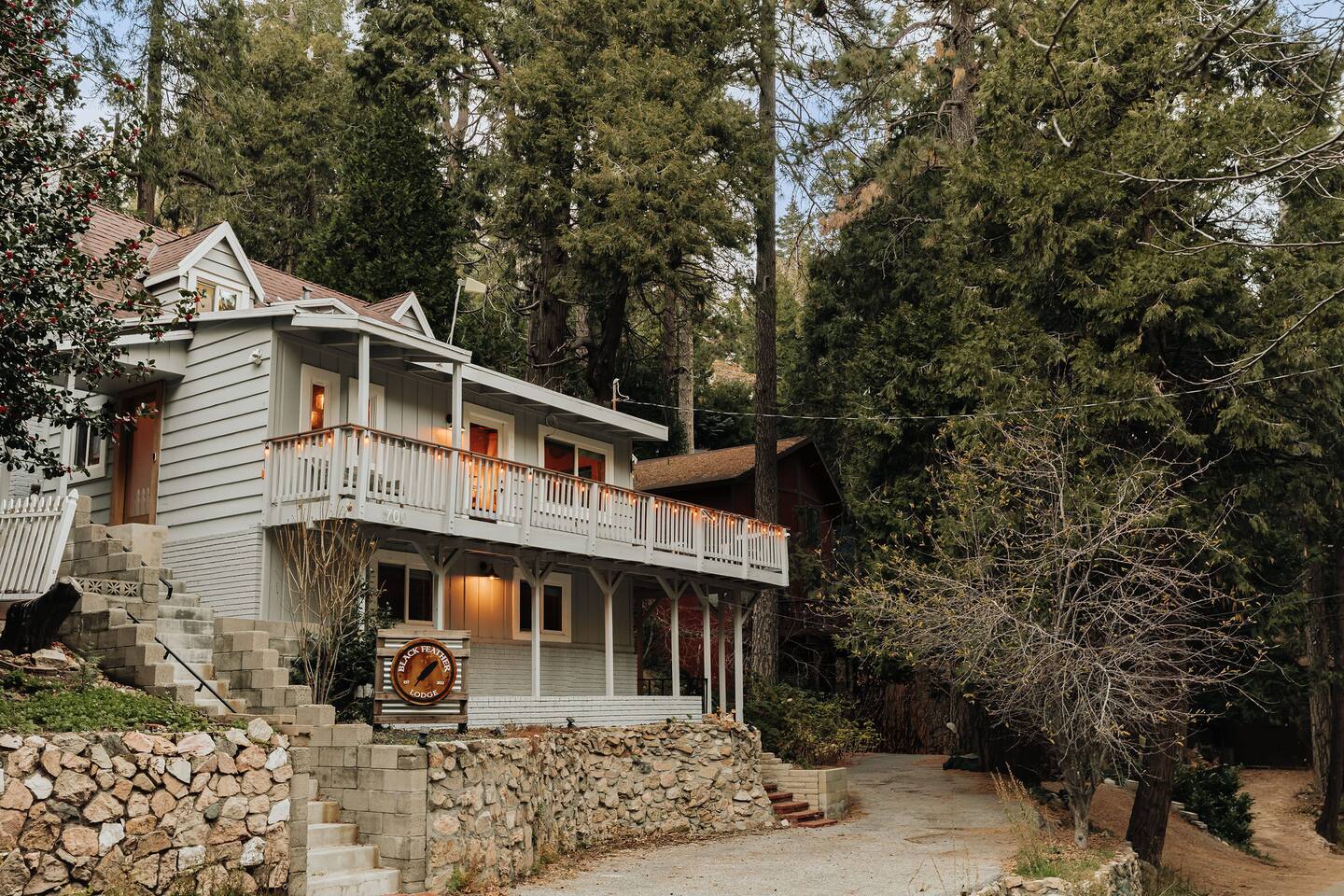 Black Feather Lodge is a tri-level cottage style home build in nineteen thirty-five and recently upgraded with “vintage-modern” amenities. It features 4 bedrooms and 2.5 bathrooms and is capable of sleeping 10 guests. The main level includes a bedroom and bathroom, living room, kitchen and dining and a wraparound deck. Upstairs are 2 more bedrooms and a half bathroom. Downstairs is the “Bunk Room” and includes a full bathroom and laundry room. Behind the Lodge is a patio with Adirondack chairs for lounging around the firepit, a detached Studio which can be used as an office space, and a fenced side yard. The level driveway can fit 4 vehicles comfortably. The Lodge is easily accessible via main roads in the neighborhood and does not require 4-wheel drive for access.