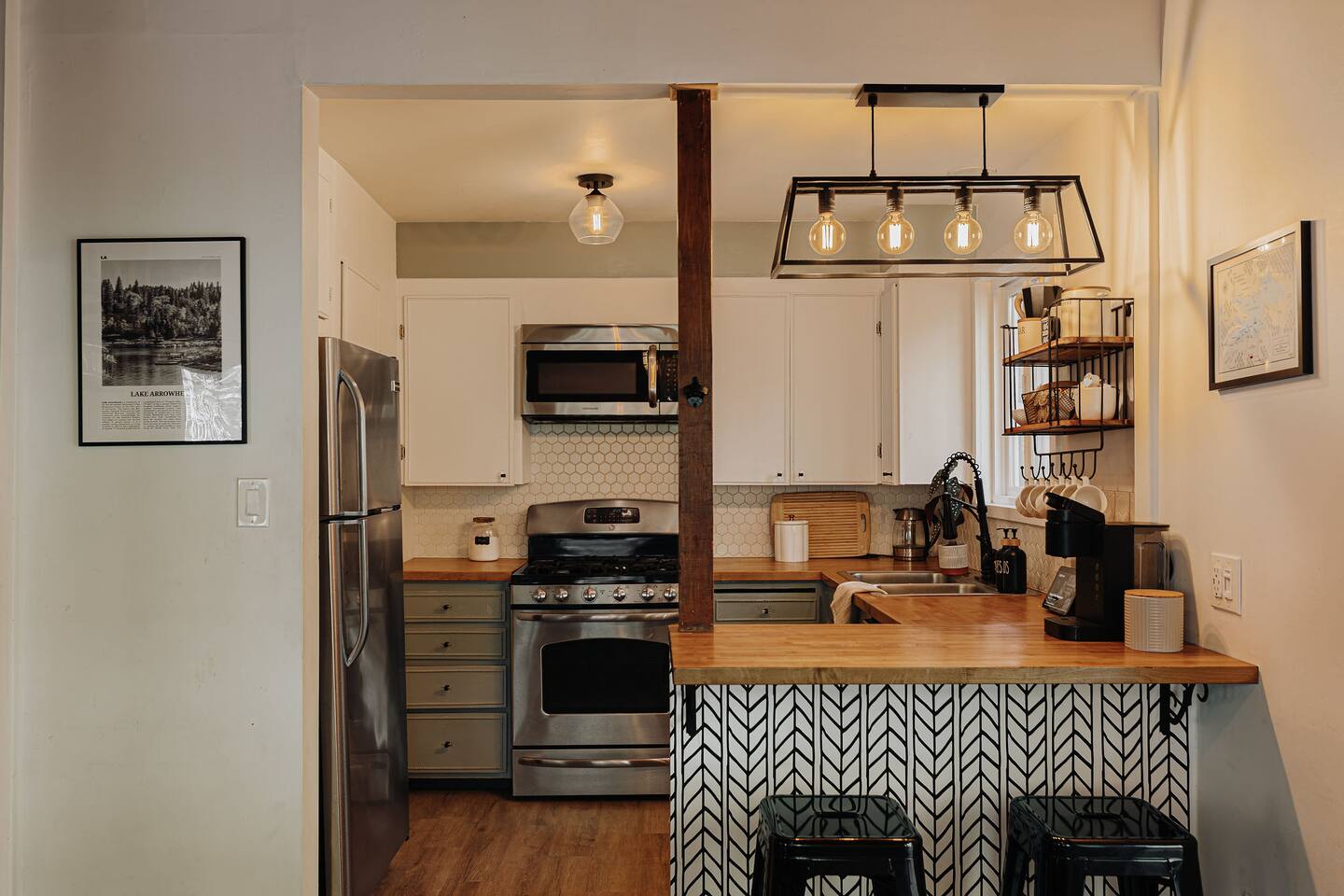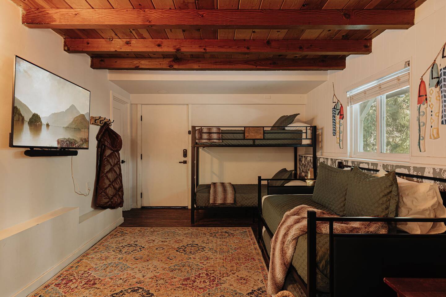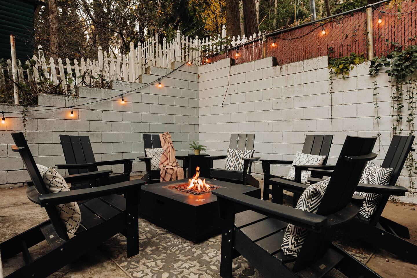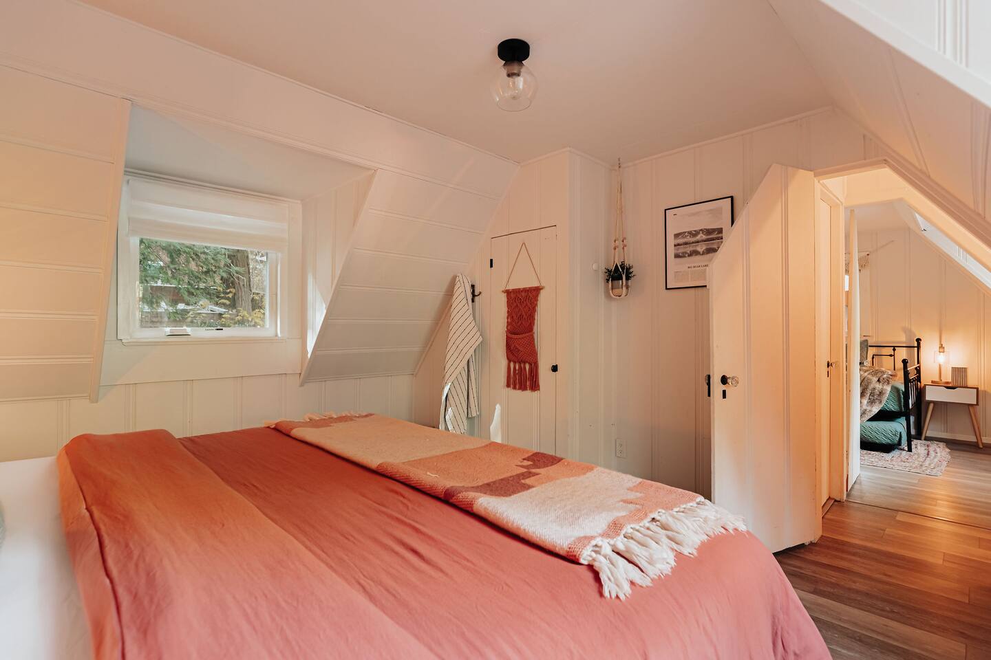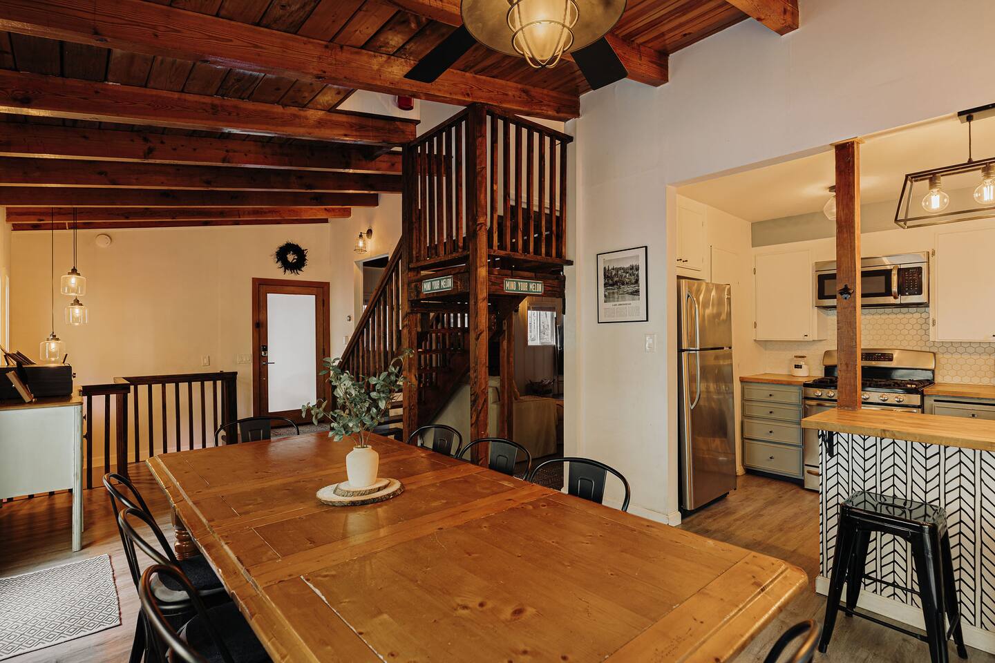 Black Feather Lodge is a tri-level cottage style home build in nineteen thirty-five and recently upgraded with “vintage-modern” amenities. It features 4 bedrooms and 2.5 bathrooms and is capable of sleeping 10 guests. The main level includes a bedroom and bathroom, living room, kitchen and dining and a wraparound deck. Upstairs are 2 more bedrooms and a half bathroom. Downstairs is the “Bunk Room” and includes a full bathroom and laundry room. Behind the Lodge is a patio with Adirondack chairs for lounging around the firepit, a detached Studio which can be used as an office space, and a fenced side yard. The level driveway can fit 4 vehicles comfortably. The Lodge is easily accessible via main roads in the neighborhood and does not require 4-wheel drive for access.