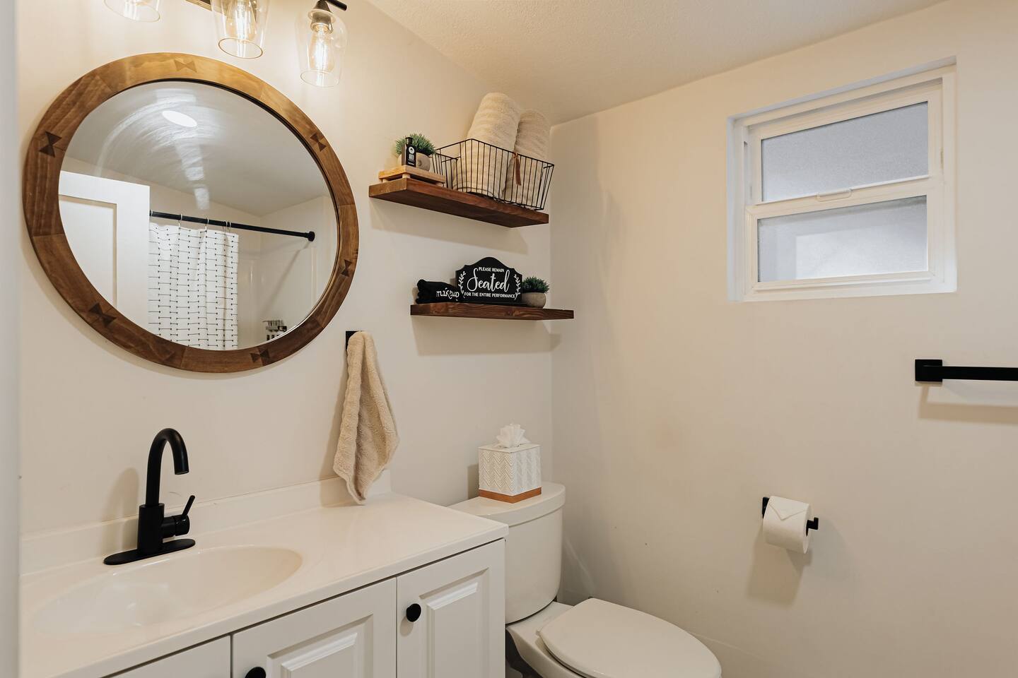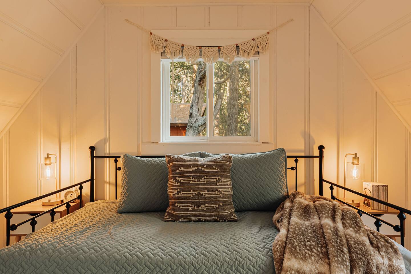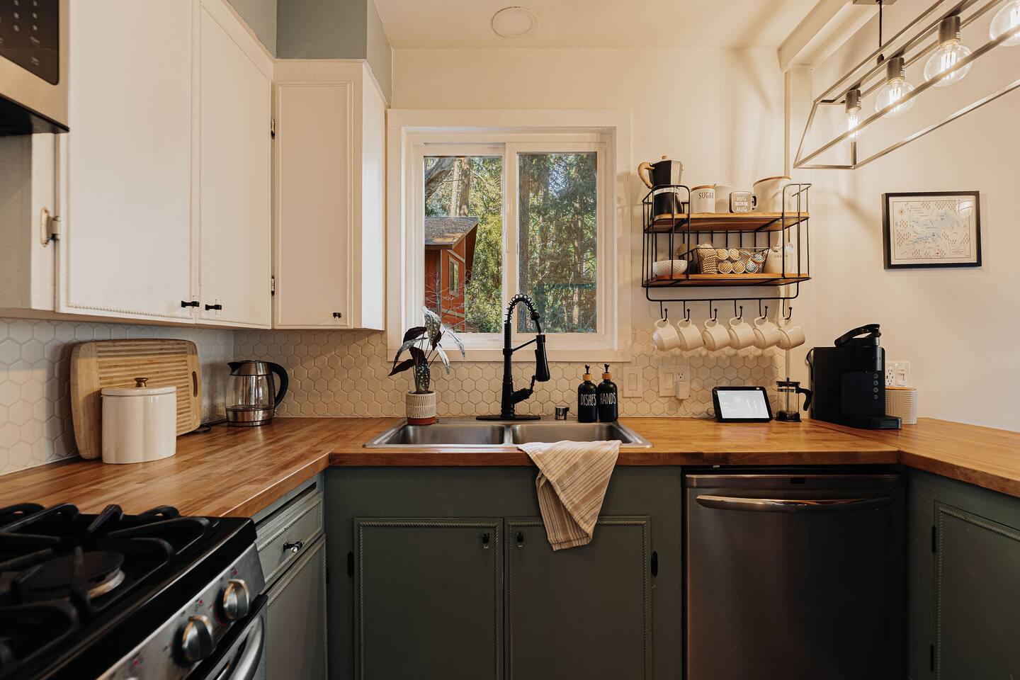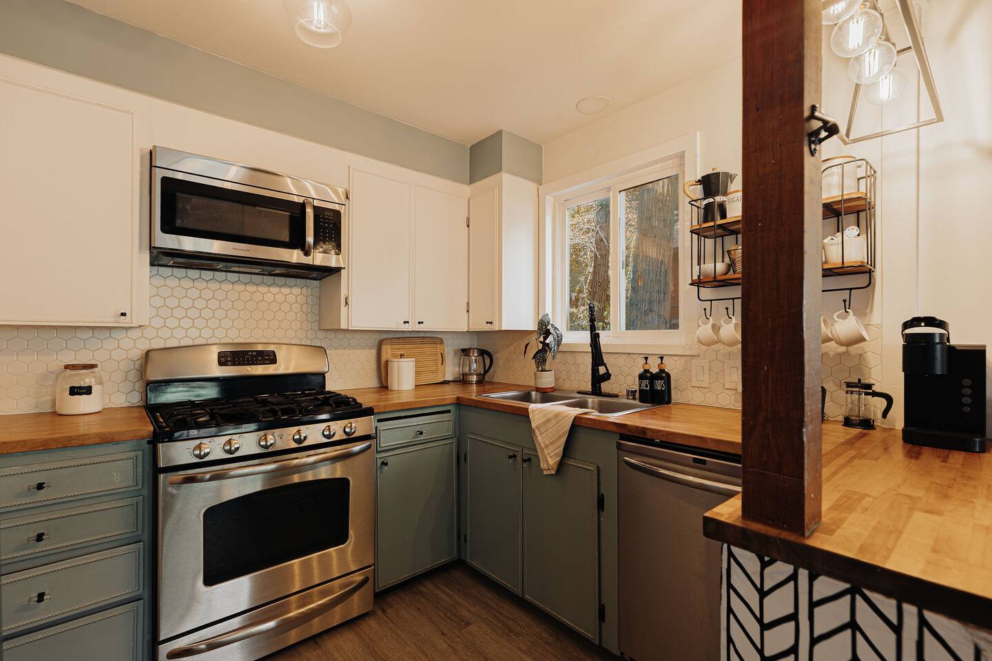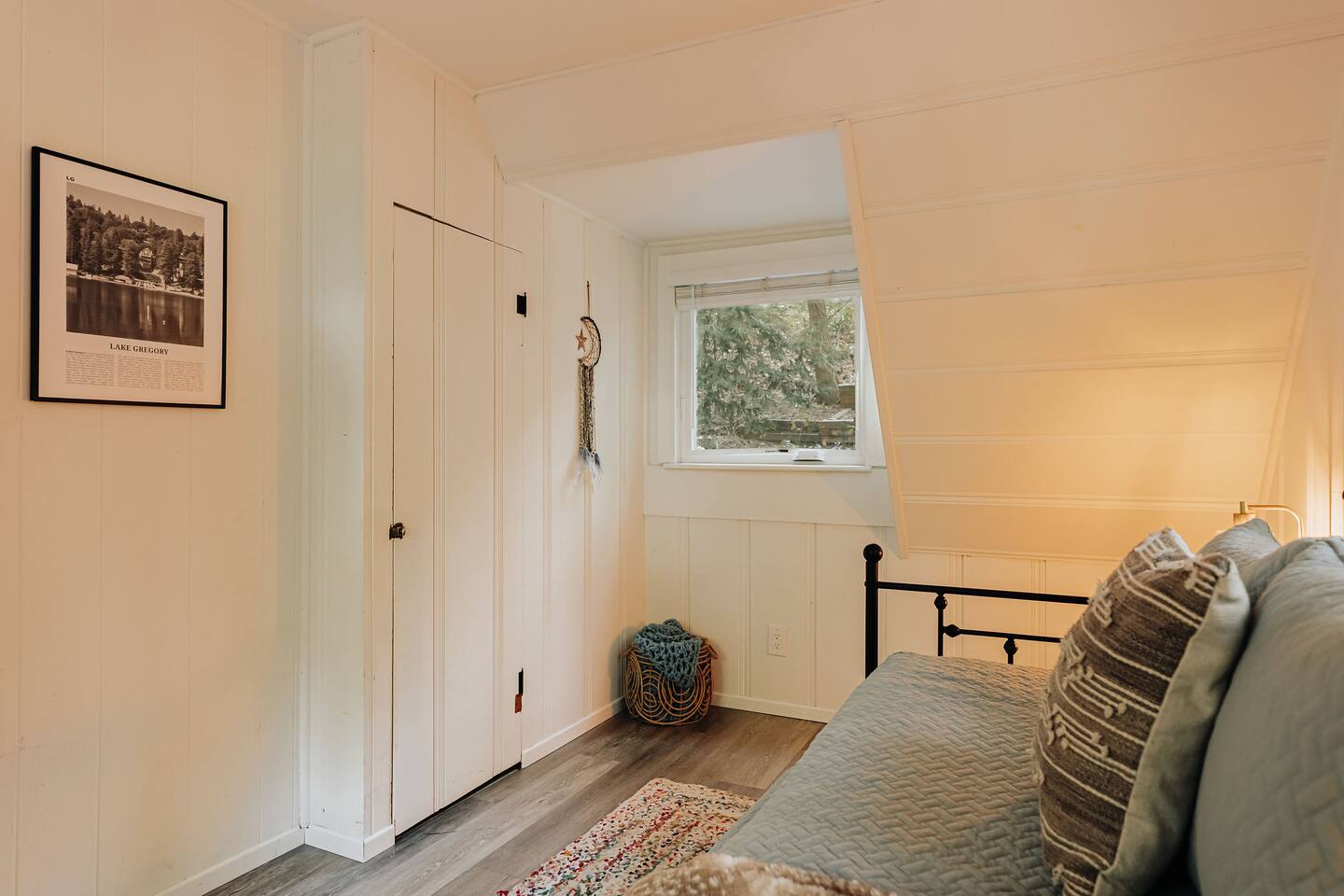 Black Feather Lodge is a tri-level cottage style home build in nineteen thirty-five and recently upgraded with “vintage-modern” amenities. It features 4 bedrooms and 2.5 bathrooms and is capable of sleeping 10 guests. The main level includes a bedroom and bathroom, living room, kitchen and dining and a wraparound deck. Upstairs are 2 more bedrooms and a half bathroom. Downstairs is the “Bunk Room” and includes a full bathroom and laundry room. Behind the Lodge is a patio with Adirondack chairs for lounging around the firepit, a detached Studio which can be used as an office space, and a fenced side yard. The level driveway can fit 4 vehicles comfortably. The Lodge is easily accessible via main roads in the neighborhood and does not require 4-wheel drive for access.