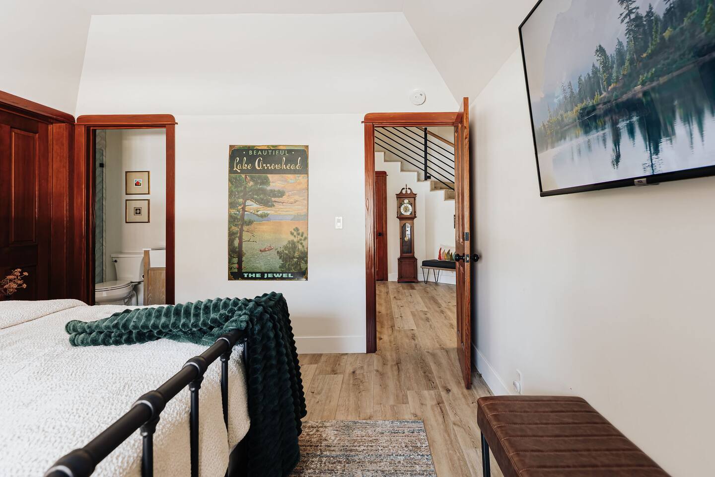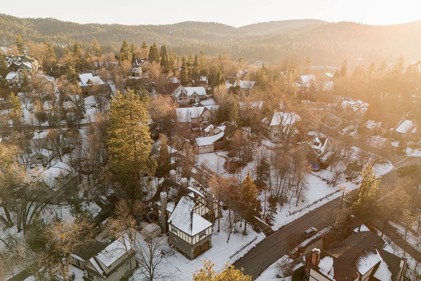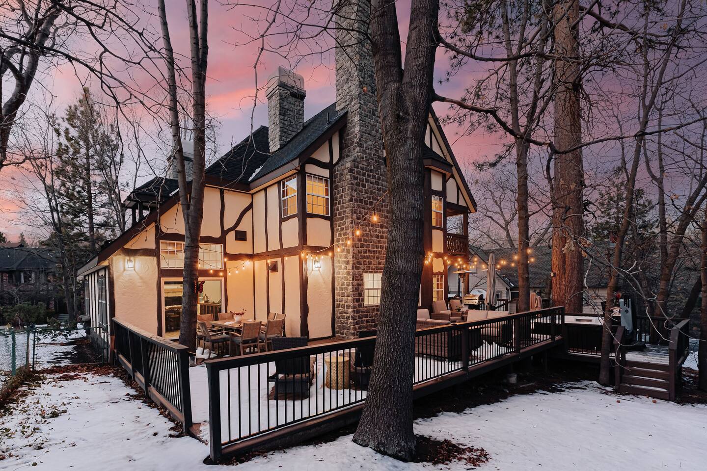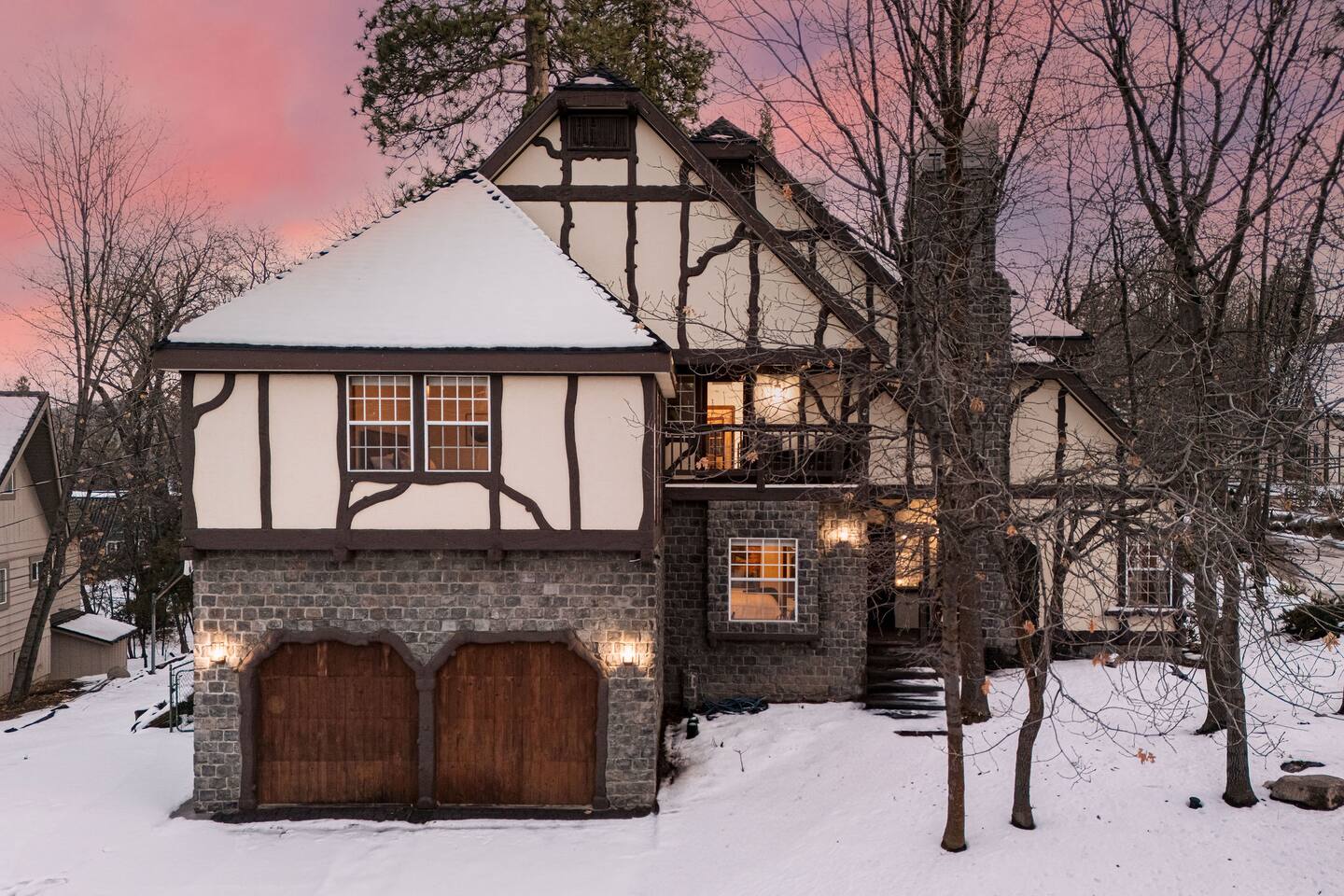 *The space includes a bedroom (Cal King with en-suite) on the main level. Three additional bedrooms with an en-suite are located upstairs, along with the last bedroom which has its own bathroom across the hall. MAX OCCUPANCY: 12 guests (including kids) MAX PARKING: 4 cars Sorry, no pets allowed. BEDROOM 1: Located on the main level, this Cal King bedroom has an en-suite attached & tv. BEDROOM 2: This spacious master bedroom with a luxurious Cal King bed, gas fireplace, tv, sitting area, and the most luxurious bathroom boasting a soaking tub overlooking forest views. BEDROOM 3: This bedroom located at the end of the hallways also has a Cal King bed, tv, and its own private en-suite. BEDROOM 4: This spacious room has two Full-Over-Full bunk beds for a total of 4 beds, a TV, board games, and its own private en-suite bathroom. BEDROOM 5: The last bedroom has a Cal King bed, tv, and has a bathroom that's located across the hall. Must be 21+ years to book as per San Bernardino County regulations. For your security, we have two exterior cameras. One is above the garage facing the street & the second is at the garage corner facing the front yard walkway. Ring doorbell located near front door. *WINTER TRAVEL: Please note that during winter, you are required to carry snow tire chains with you. The mountain weather changes frequently & we want all our guests to come prepared. During snow, we clear the driveway & the entrance to the front door upon arrival. After that, we provide shovels & snow removal contacts if you need it for the duration of your stay. If you are unsure about driving in the snow, please make sure to get travel insurance.
