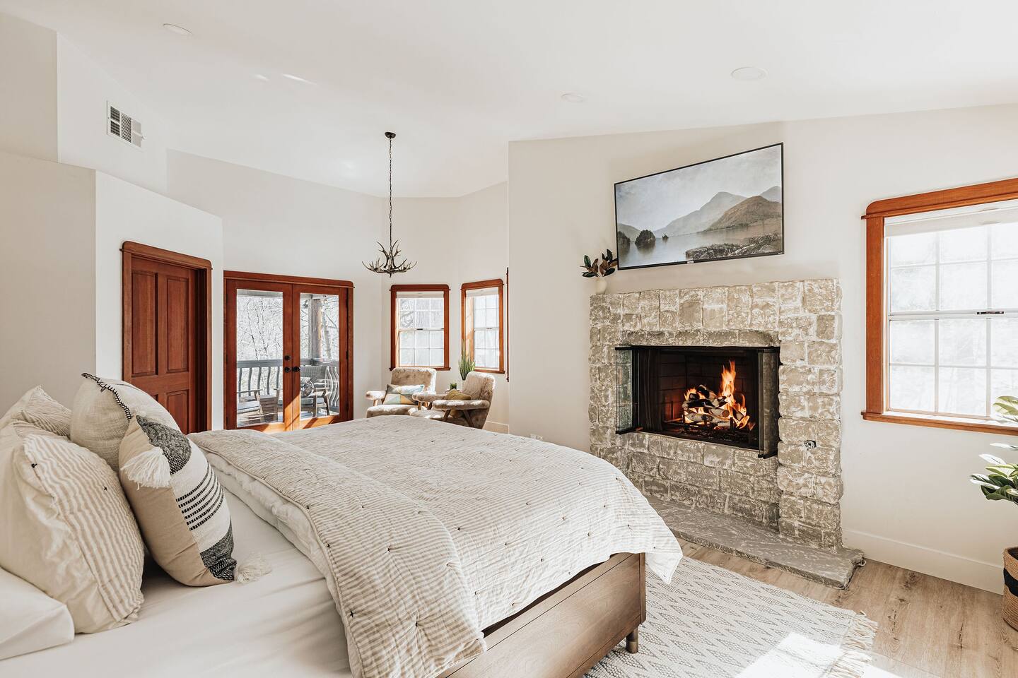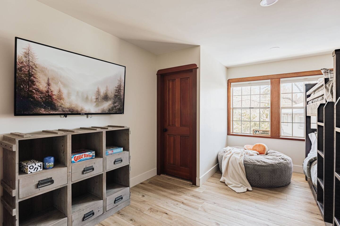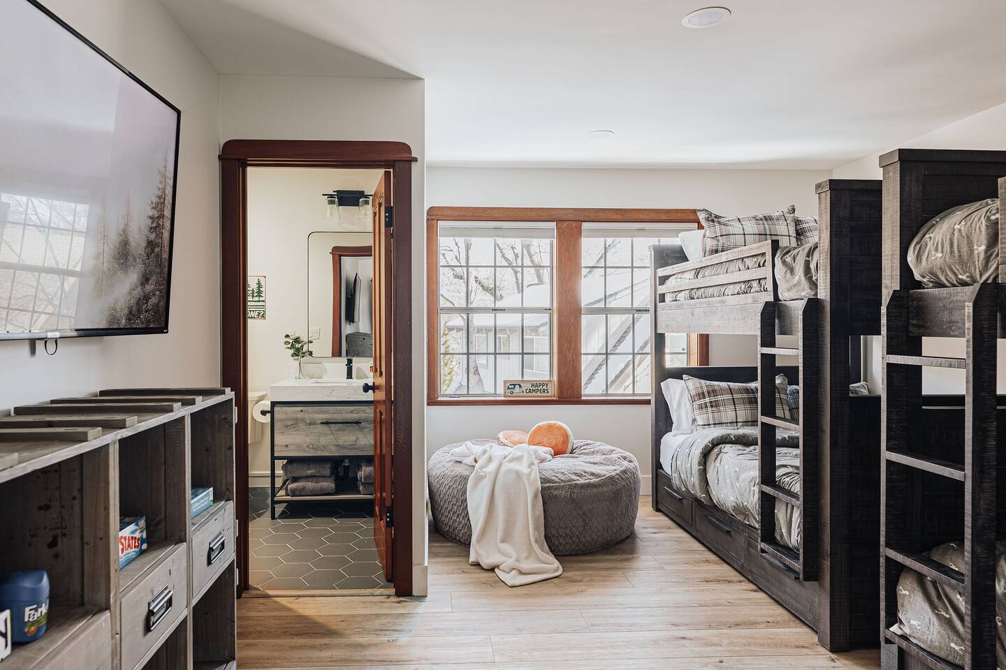 *The space includes a bedroom (Cal King with en-suite) on the main level. Three additional bedrooms with an en-suite are located upstairs, along with the last bedroom which has its own bathroom across the hall. MAX OCCUPANCY: 12 guests (including kids) MAX PARKING: 4 cars Sorry, no pets allowed. BEDROOM 1: Located on the main level, this Cal King bedroom has an en-suite attached & tv. BEDROOM 2: This spacious master bedroom with a luxurious Cal King bed, gas fireplace, tv, sitting area, and the most luxurious bathroom boasting a soaking tub overlooking forest views. BEDROOM 3: This bedroom located at the end of the hallways also has a Cal King bed, tv, and its own private en-suite. BEDROOM 4: This spacious room has two Full-Over-Full bunk beds for a total of 4 beds, a TV, board games, and its own private en-suite bathroom. BEDROOM 5: The last bedroom has a Cal King bed, tv, and has a bathroom that's located across the hall. Must be 21+ years to book as per San Bernardino County regulations. For your security, we have two exterior cameras. One is above the garage facing the street & the second is at the garage corner facing the front yard walkway. Ring doorbell located near front door. *WINTER TRAVEL: Please note that during winter, you are required to carry snow tire chains with you. The mountain weather changes frequently & we want all our guests to come prepared. During snow, we clear the driveway & the entrance to the front door upon arrival. After that, we provide shovels & snow removal contacts if you need it for the duration of your stay. If you are unsure about driving in the snow, please make sure to get travel insurance.