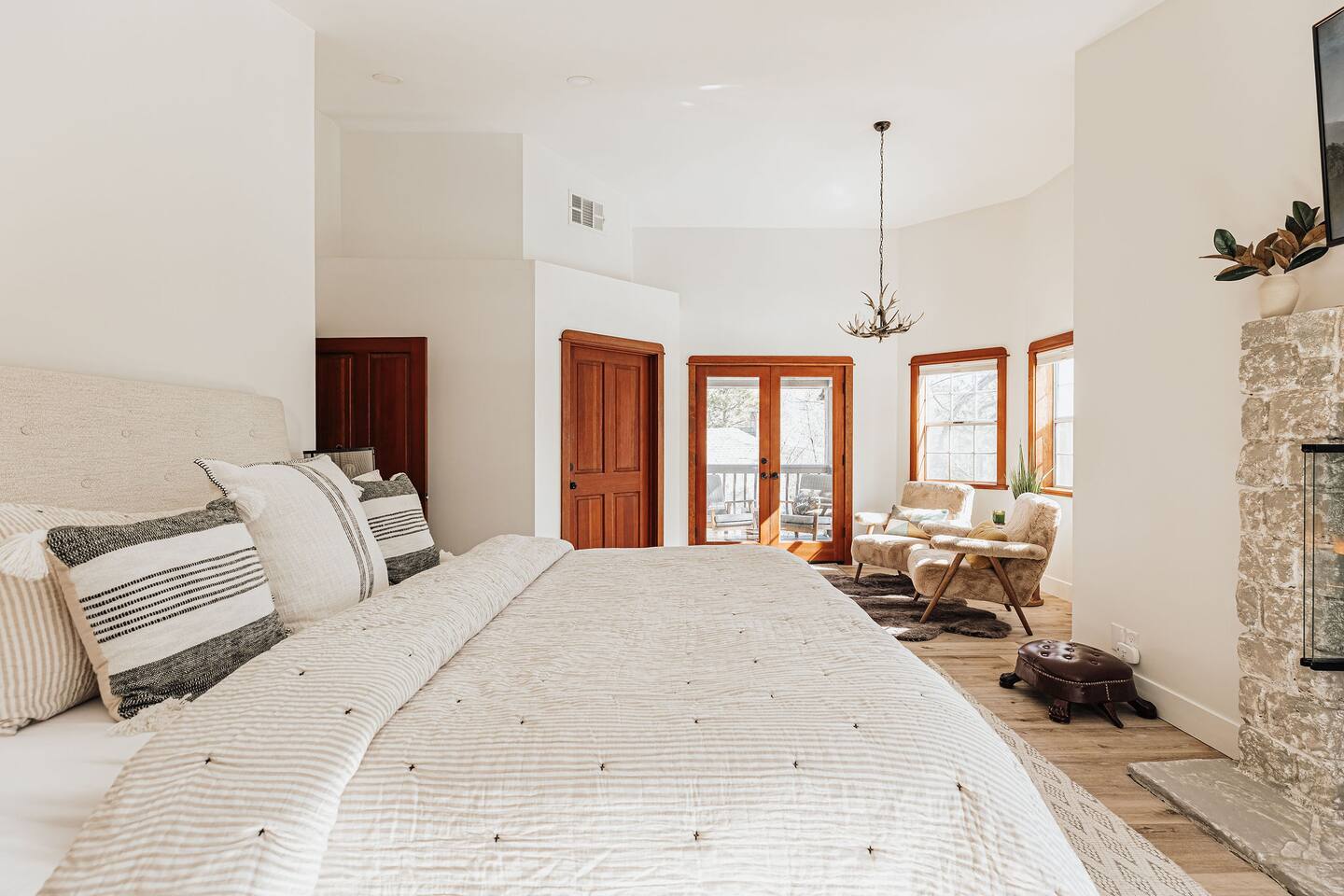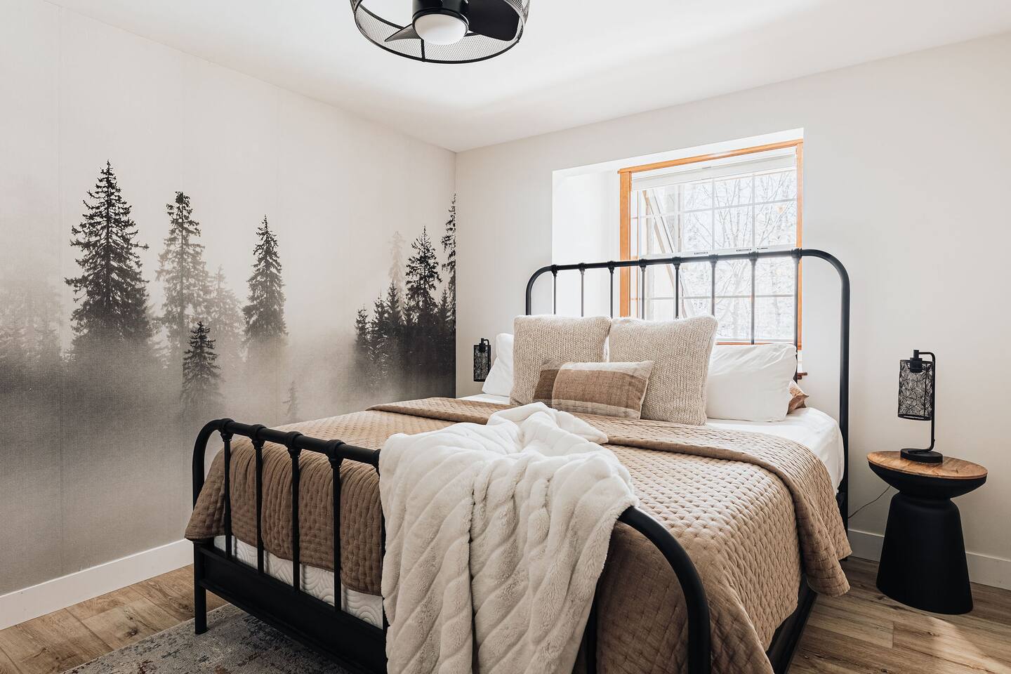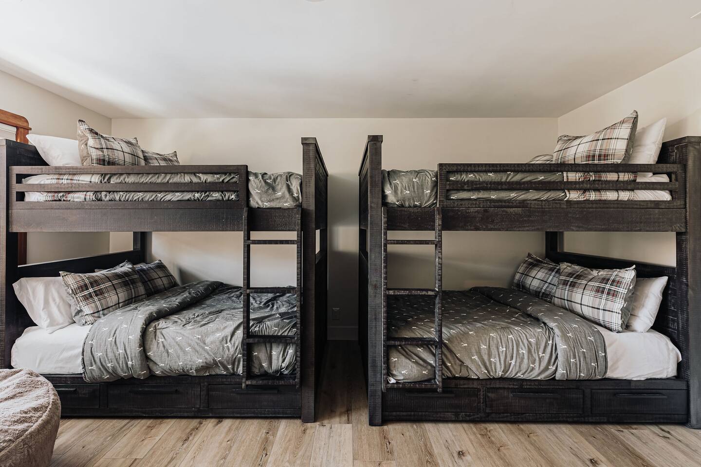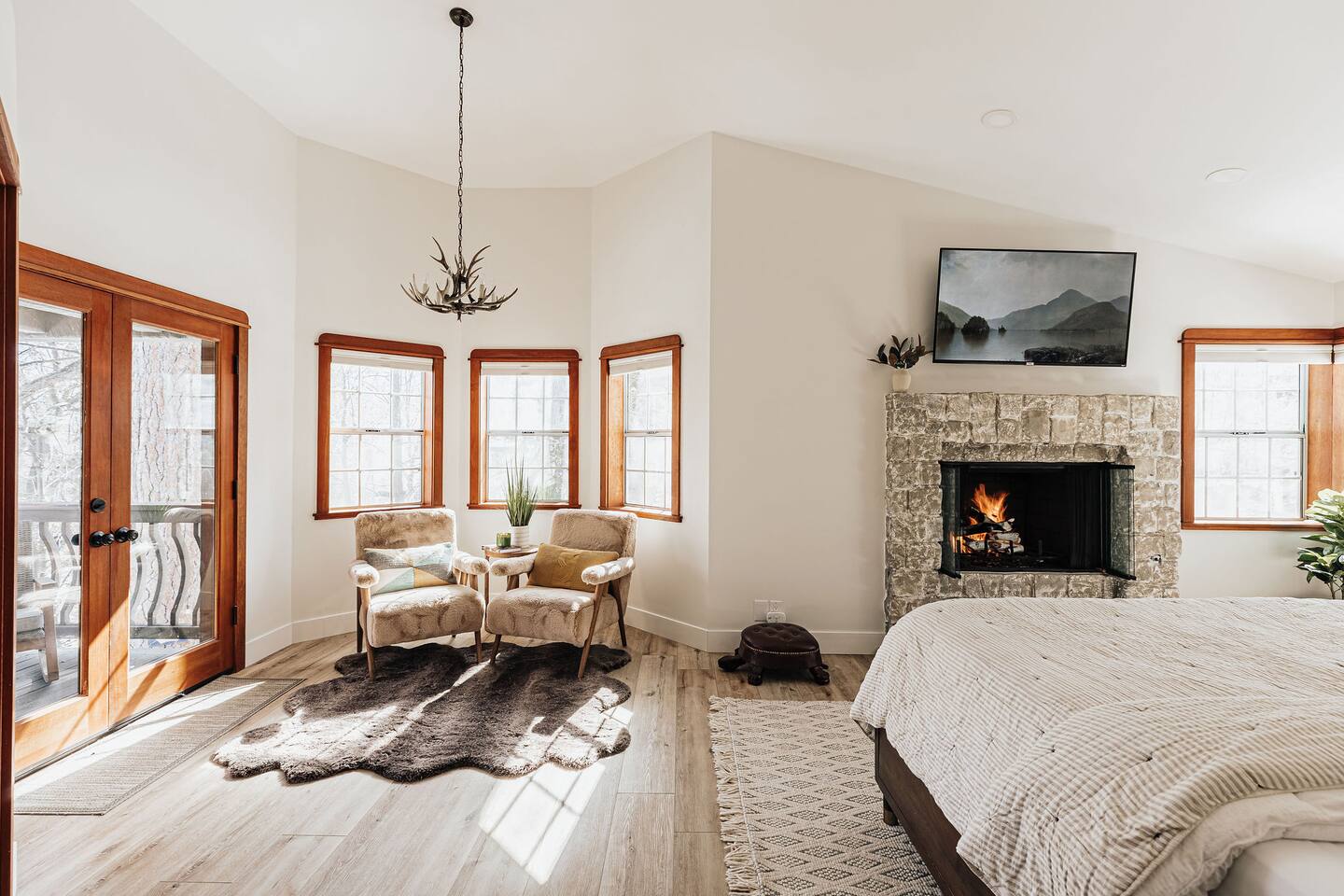 *The space includes a bedroom (Cal King with en-suite) on the main level. Three additional bedrooms with an en-suite are located upstairs, along with the last bedroom which has its own bathroom across the hall. MAX OCCUPANCY: 12 guests (including kids) MAX PARKING: 4 cars Sorry, no pets allowed. BEDROOM 1: Located on the main level, this Cal King bedroom has an en-suite attached & tv. BEDROOM 2: This spacious master bedroom with a luxurious Cal King bed, gas fireplace, tv, sitting area, and the most luxurious bathroom boasting a soaking tub overlooking forest views. BEDROOM 3: This bedroom located at the end of the hallways also has a Cal King bed, tv, and its own private en-suite. BEDROOM 4: This spacious room has two Full-Over-Full bunk beds for a total of 4 beds, a TV, board games, and its own private en-suite bathroom. BEDROOM 5: The last bedroom has a Cal King bed, tv, and has a bathroom that's located across the hall. Must be 21+ years to book as per San Bernardino County regulations. For your security, we have two exterior cameras. One is above the garage facing the street & the second is at the garage corner facing the front yard walkway. Ring doorbell located near front door. *WINTER TRAVEL: Please note that during winter, you are required to carry snow tire chains with you. The mountain weather changes frequently & we want all our guests to come prepared. During snow, we clear the driveway & the entrance to the front door upon arrival. After that, we provide shovels & snow removal contacts if you need it for the duration of your stay. If you are unsure about driving in the snow, please make sure to get travel insurance.