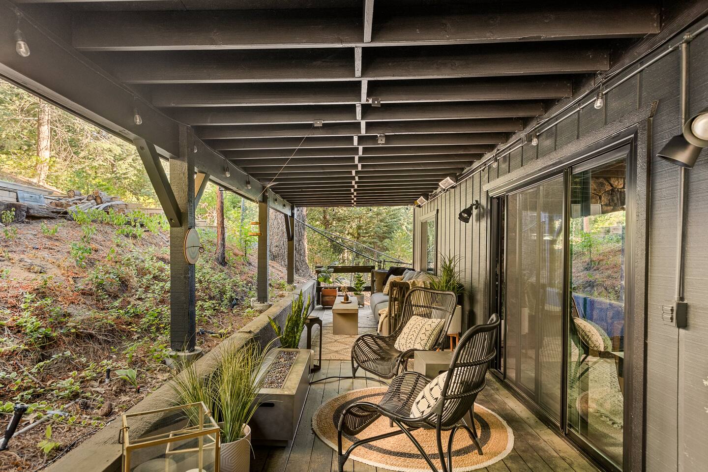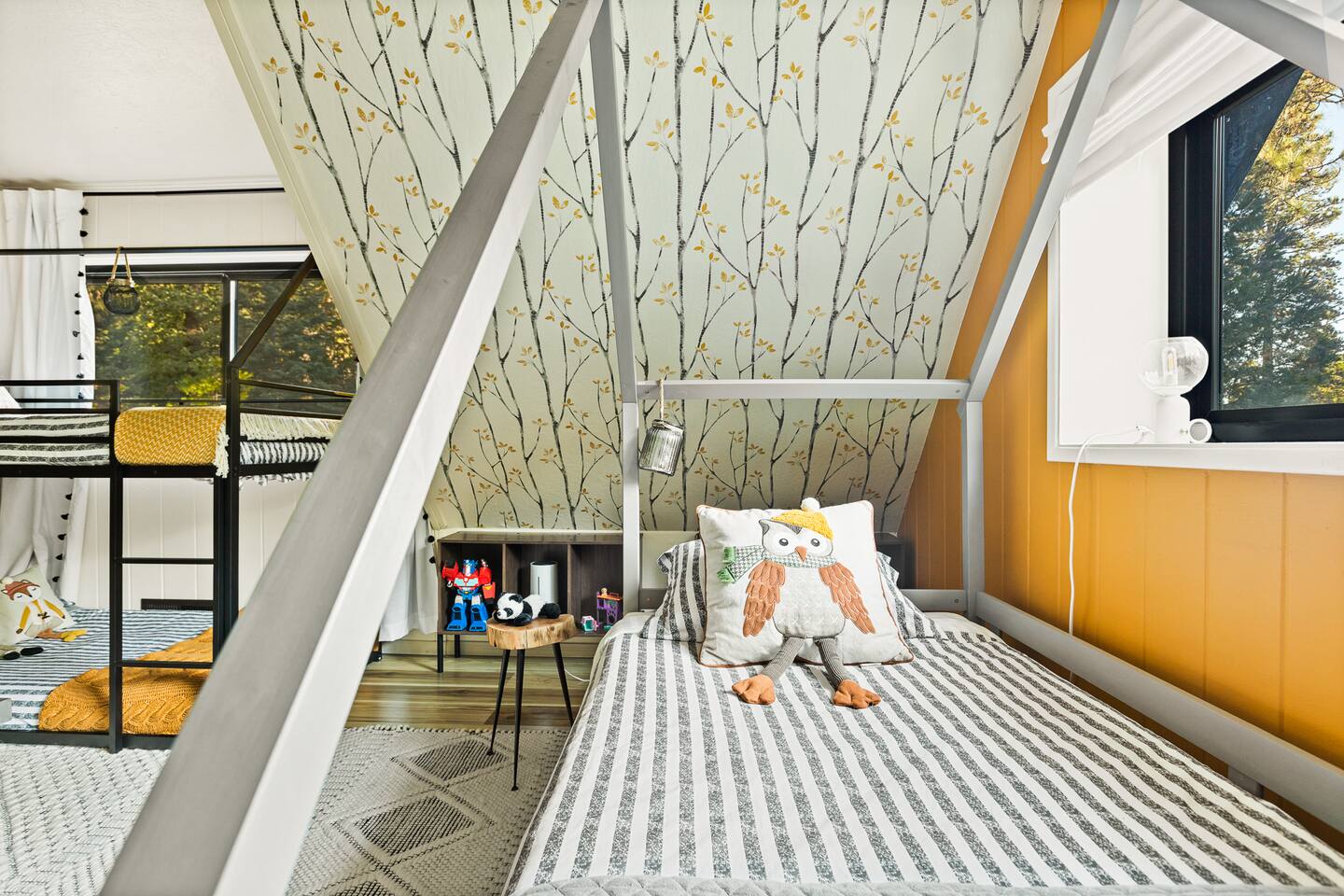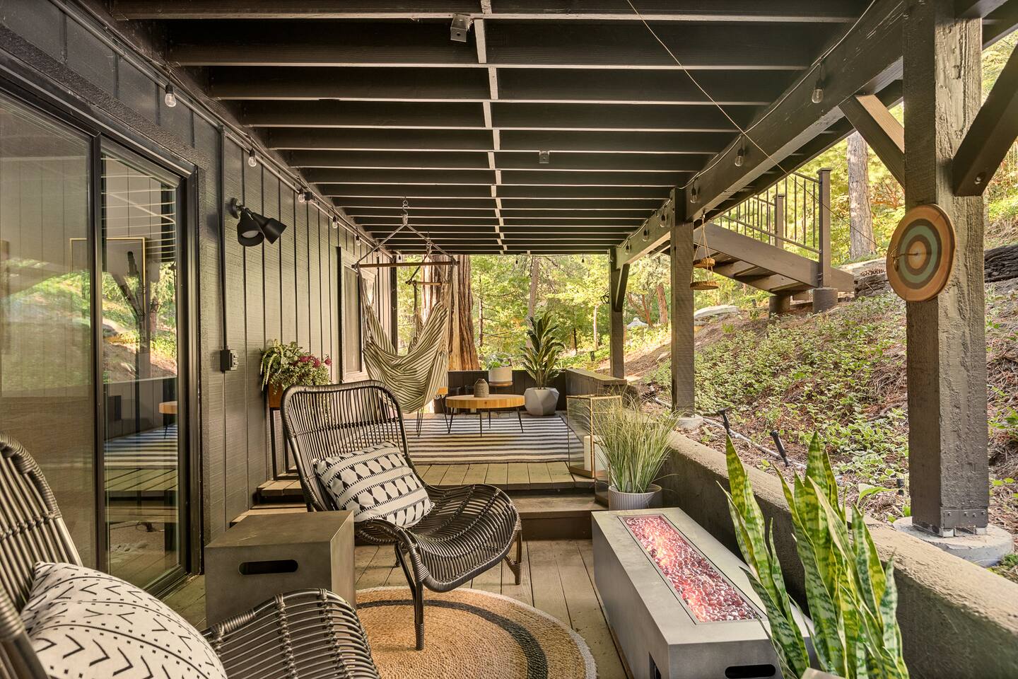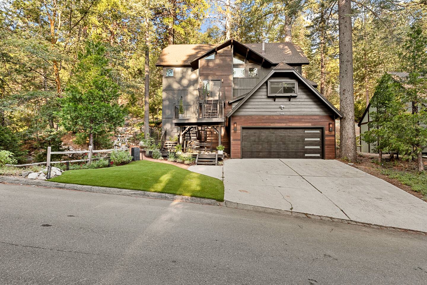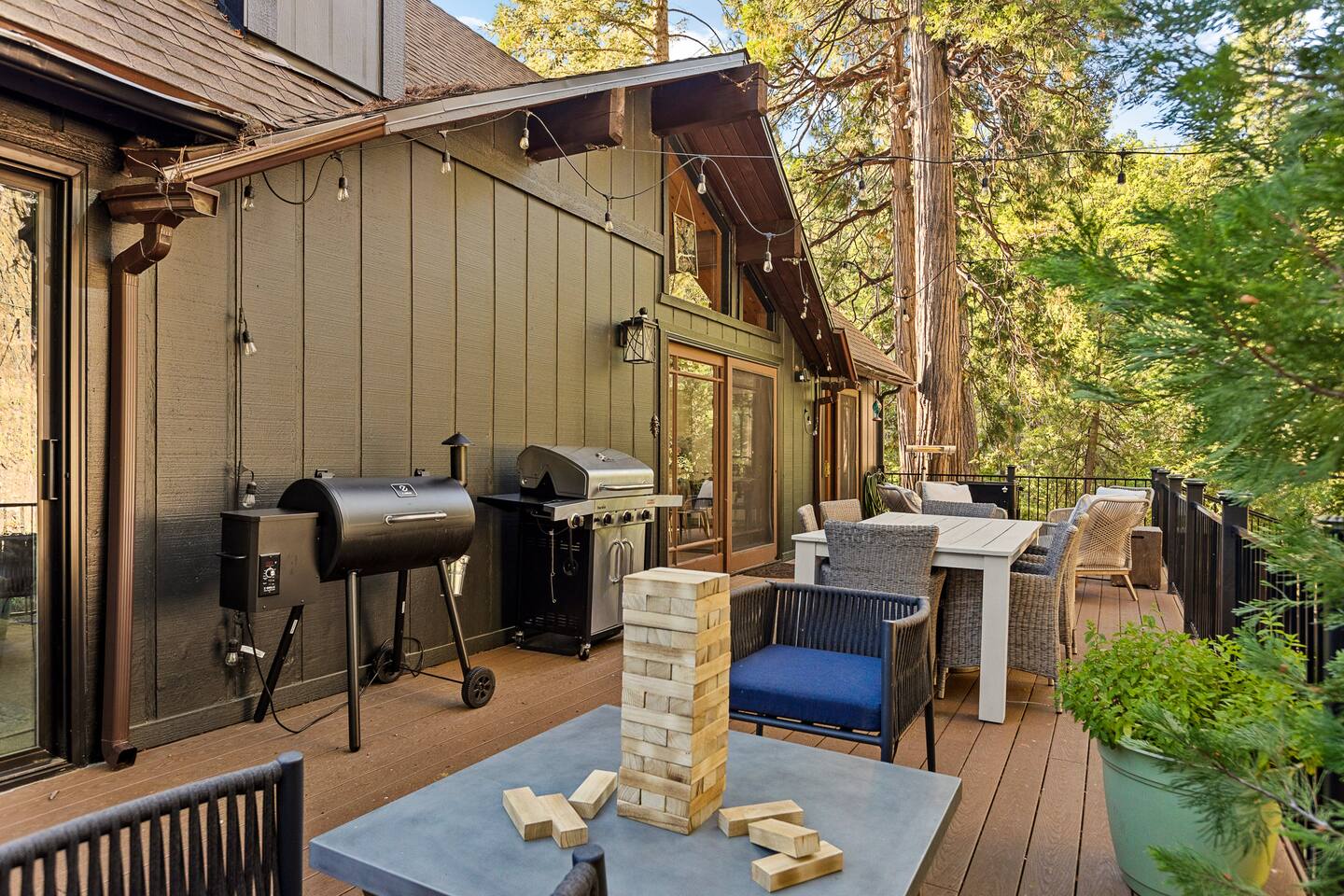 MAX OCCUPANCY: 10 guests (including children) PARKING: We have parking up to 3 cars max in our driveway. Please do not park on the turf grass. Street parking is not allowed & will get fined, so please plan accordingly. *3 Levels, 4 Bedrooms, 3 Full Bathrooms, 2,228 sq ft TOP FLOOR: On the top floor, a spacious open floor plan awaits. A generously sized living room with a large couch and a 55" Smart TV provides the ideal space for family gatherings or relaxation after a day of adventure. Connected to this, a fully equipped kitchen stands ready for your culinary adventures. With two full ovens and a 4-burner stove, plus all the kitchen amenities. On the upper deck, you'll also find a BBQ, a smoker, a fire pit, and ample seating, providing everything you need to fully immerse yourself in the great outdoors on your trip. Bedroom 1: Upstairs, a king-size bed with a firm foam mattress awaits in a bedroom directly connected to the upper deck. The thoughtfully curated decor sets a warm ambiance, ensuring a restful and delightful stay. Bathroom 1: Adjacent to Bedroom 1 and the Living Room on the upper floor is a luxurious bathroom, offering a shower, bathtub, and full sink. MIDDLE FLOOR: Descending the staircase leads you to the Family Room. This spacious area is perfect for unwinding by a cozy fire and enjoying a movie or playing games, including a full-sized Shuffleboard with mini bowling. A mini bar allows you to craft your favorite cocktails. Bedroom 2: Directly off the Family Room, you'll find a stunning Queen Bedroom. Bathroom 2: Conveniently located directly next to Bedroom 2 and off of the Family Room, this bathroom boasts modern touches and a full shower and bathtub. Bedroom 3: Another bedroom, just off the Family Room, offers a Queen Firm Foam Mattress and modern bohemian decor. If you're working remotely, a private desk in this room allows you to extend your stay and enjoy your vacation with friends & family. Bathroom 3: Just across from Bedroom 3 and adjacent to the Family Room is another well-designed and modern full bathroom, complete with an additional shower and bathtub. Bedroom 4 - The Kids Room: This imaginative space is perfect for kids to play, create, and dream up adventures while you relax in the house. With 3 twin beds and the ability to convert one into a king by pulling out the lower drawers, this room offers flexibility for your family's needs. Lower Patio: Adjacent to the Family Room, step into an expansive outdoor haven. Equipped with two inviting hammock chairs, a cozy fireplace seating area, and a generously sized outdoor sofa, you'll find everything you need to settle in and relax amongst the trees. For those slightly chilly nights, we've even provided space heaters, ensuring your complete comfort as you immerse yourself in nature. LOWER LEVEL: The lower level houses a convenient laundry room with a full washer and dryer, to freshen up during your travels. Each bedroom features high-end mattresses, and the entire cabin has been thoughtfully renovated to provide a fresh and modern atmosphere while being nestled in the forest. PETS: We allow up to two house-trained, well behaved dogs at the cabin but they MUST be added to the reservation guest count. Please make sure to bring any additional supplies needed with you & pick up after them. Dogs must NEVER be left at the home unattended, unless crated. Please note: we do not allow dogs on any of the furniture. No cats please. Central Heating throughout. Central Air Conditioning is only available on the top floor as the bottom floors stay cool. We do provide additional portable fans for your convenience. LAKE ACCESS: Our property provides exclusive access to the Lake Arrowhead trails. After booking, you will be able to fill out a form with guest info so we can add you into the system. Per San Bernardino County regulation, you must be 21+ to book.