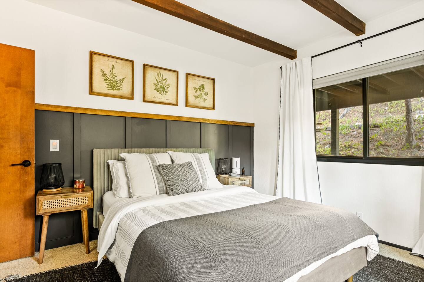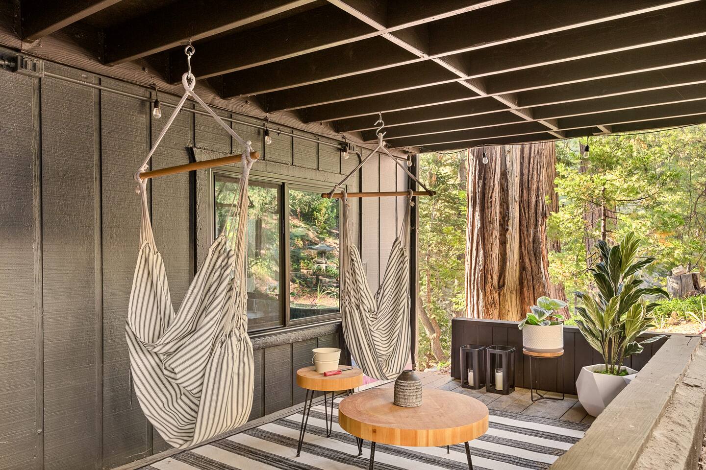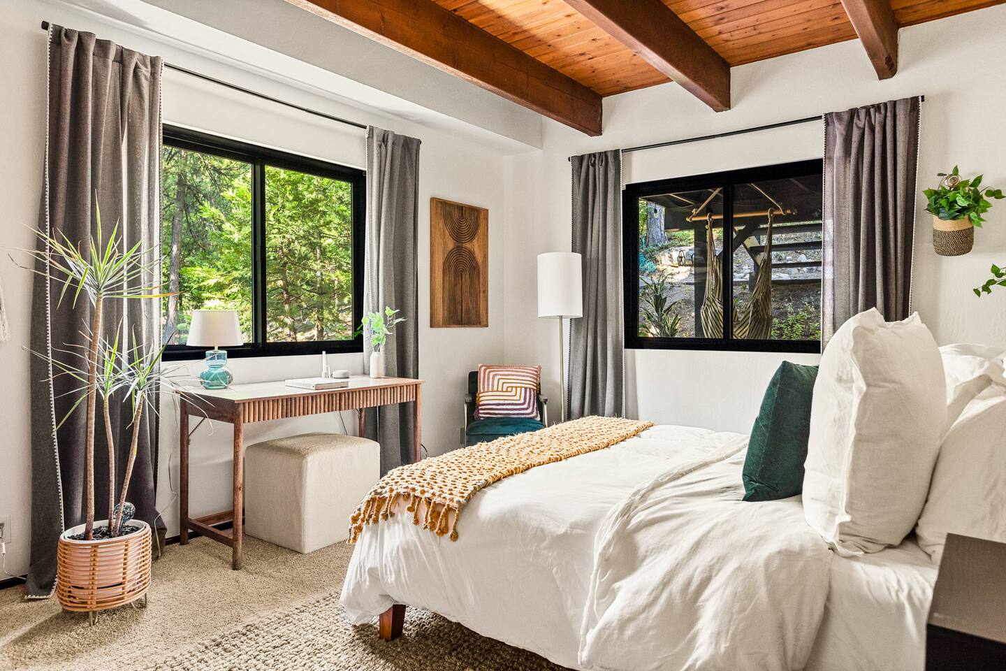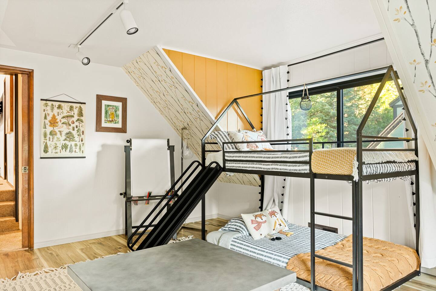 MAX OCCUPANCY: 10 guests (including children) PARKING: We have parking up to 3 cars max in our driveway. Please do not park on the turf grass. Street parking is not allowed & will get fined, so please plan accordingly. *3 Levels, 4 Bedrooms, 3 Full Bathrooms, 2,228 sq ft TOP FLOOR: On the top floor, a spacious open floor plan awaits. A generously sized living room with a large couch and a 55" Smart TV provides the ideal space for family gatherings or relaxation after a day of adventure. Connected to this, a fully equipped kitchen stands ready for your culinary adventures. With two full ovens and a 4-burner stove, plus all the kitchen amenities. On the upper deck, you'll also find a BBQ, a smoker, a fire pit, and ample seating, providing everything you need to fully immerse yourself in the great outdoors on your trip. Bedroom 1: Upstairs, a king-size bed with a firm foam mattress awaits in a bedroom directly connected to the upper deck. The thoughtfully curated decor sets a warm ambiance, ensuring a restful and delightful stay. Bathroom 1: Adjacent to Bedroom 1 and the Living Room on the upper floor is a luxurious bathroom, offering a shower, bathtub, and full sink. MIDDLE FLOOR: Descending the staircase leads you to the Family Room. This spacious area is perfect for unwinding by a cozy fire and enjoying a movie or playing games, including a full-sized Shuffleboard with mini bowling. A mini bar allows you to craft your favorite cocktails. Bedroom 2: Directly off the Family Room, you'll find a stunning Queen Bedroom. Bathroom 2: Conveniently located directly next to Bedroom 2 and off of the Family Room, this bathroom boasts modern touches and a full shower and bathtub. Bedroom 3: Another bedroom, just off the Family Room, offers a Queen Firm Foam Mattress and modern bohemian decor. If you're working remotely, a private desk in this room allows you to extend your stay and enjoy your vacation with friends & family. Bathroom 3: Just across from Bedroom 3 and adjacent to the Family Room is another well-designed and modern full bathroom, complete with an additional shower and bathtub. Bedroom 4 - The Kids Room: This imaginative space is perfect for kids to play, create, and dream up adventures while you relax in the house. With 3 twin beds and the ability to convert one into a king by pulling out the lower drawers, this room offers flexibility for your family's needs. Lower Patio: Adjacent to the Family Room, step into an expansive outdoor haven. Equipped with two inviting hammock chairs, a cozy fireplace seating area, and a generously sized outdoor sofa, you'll find everything you need to settle in and relax amongst the trees. For those slightly chilly nights, we've even provided space heaters, ensuring your complete comfort as you immerse yourself in nature. LOWER LEVEL: The lower level houses a convenient laundry room with a full washer and dryer, to freshen up during your travels. Each bedroom features high-end mattresses, and the entire cabin has been thoughtfully renovated to provide a fresh and modern atmosphere while being nestled in the forest. PETS: We allow up to two house-trained, well behaved dogs at the cabin but they MUST be added to the reservation guest count. Please make sure to bring any additional supplies needed with you & pick up after them. Dogs must NEVER be left at the home unattended, unless crated. Please note: we do not allow dogs on any of the furniture. No cats please. Central Heating throughout. Central Air Conditioning is only available on the top floor as the bottom floors stay cool. We do provide additional portable fans for your convenience. LAKE ACCESS: Our property provides exclusive access to the Lake Arrowhead trails. After booking, you will be able to fill out a form with guest info so we can add you into the system. Per San Bernardino County regulation, you must be 21+ to book.