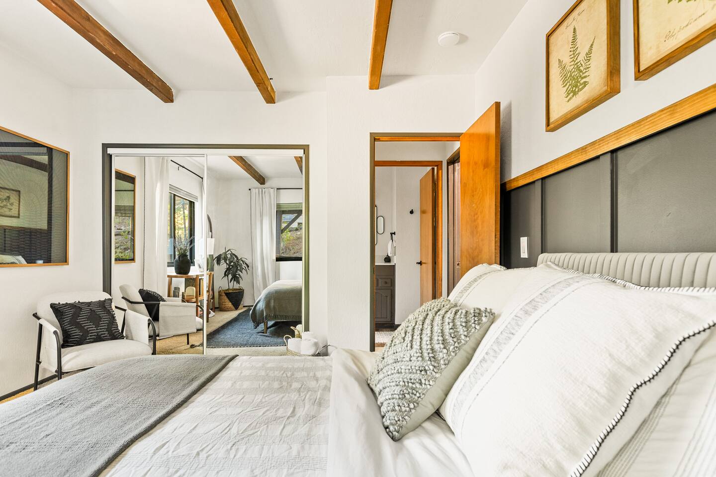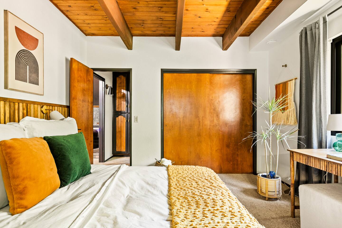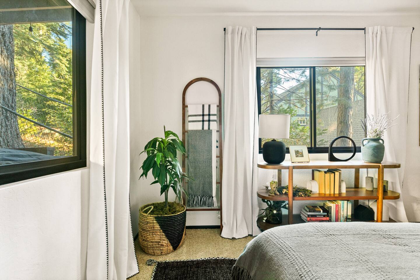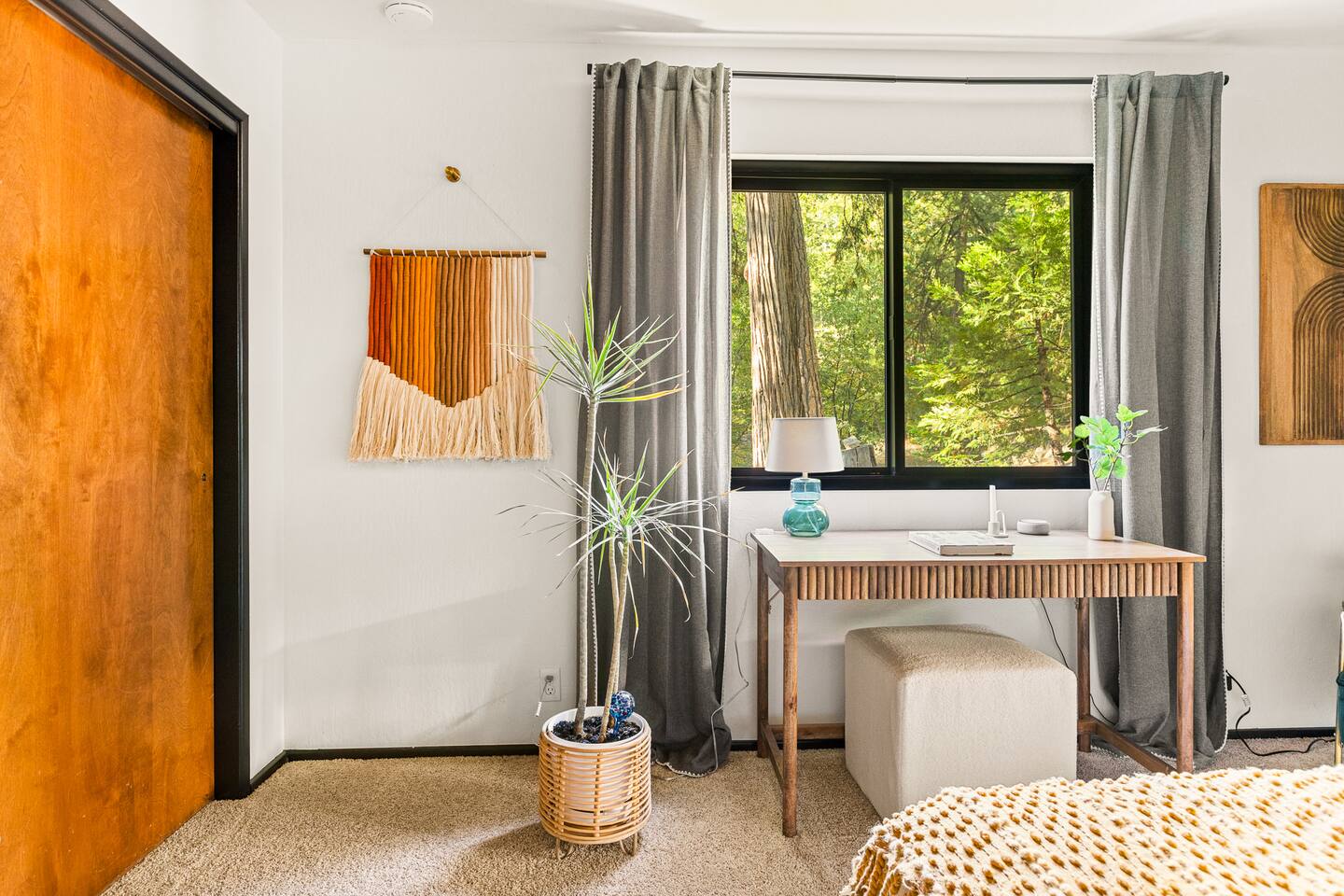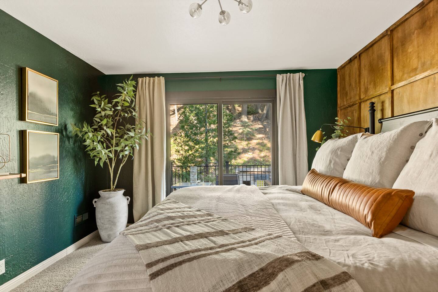 MAX OCCUPANCY: 10 guests (including children) PARKING: We have parking up to 3 cars max in our driveway. Please do not park on the turf grass. Street parking is not allowed & will get fined, so please plan accordingly. *3 Levels, 4 Bedrooms, 3 Full Bathrooms, 2,228 sq ft TOP FLOOR: On the top floor, a spacious open floor plan awaits. A generously sized living room with a large couch and a 55" Smart TV provides the ideal space for family gatherings or relaxation after a day of adventure. Connected to this, a fully equipped kitchen stands ready for your culinary adventures. With two full ovens and a 4-burner stove, plus all the kitchen amenities. On the upper deck, you'll also find a BBQ, a smoker, a fire pit, and ample seating, providing everything you need to fully immerse yourself in the great outdoors on your trip. Bedroom 1: Upstairs, a king-size bed with a firm foam mattress awaits in a bedroom directly connected to the upper deck. The thoughtfully curated decor sets a warm ambiance, ensuring a restful and delightful stay. Bathroom 1: Adjacent to Bedroom 1 and the Living Room on the upper floor is a luxurious bathroom, offering a shower, bathtub, and full sink. MIDDLE FLOOR: Descending the staircase leads you to the Family Room. This spacious area is perfect for unwinding by a cozy fire and enjoying a movie or playing games, including a full-sized Shuffleboard with mini bowling. A mini bar allows you to craft your favorite cocktails. Bedroom 2: Directly off the Family Room, you'll find a stunning Queen Bedroom. Bathroom 2: Conveniently located directly next to Bedroom 2 and off of the Family Room, this bathroom boasts modern touches and a full shower and bathtub. Bedroom 3: Another bedroom, just off the Family Room, offers a Queen Firm Foam Mattress and modern bohemian decor. If you're working remotely, a private desk in this room allows you to extend your stay and enjoy your vacation with friends & family. Bathroom 3: Just across from Bedroom 3 and adjacent to the Family Room is another well-designed and modern full bathroom, complete with an additional shower and bathtub. Bedroom 4 - The Kids Room: This imaginative space is perfect for kids to play, create, and dream up adventures while you relax in the house. With 3 twin beds and the ability to convert one into a king by pulling out the lower drawers, this room offers flexibility for your family's needs. Lower Patio: Adjacent to the Family Room, step into an expansive outdoor haven. Equipped with two inviting hammock chairs, a cozy fireplace seating area, and a generously sized outdoor sofa, you'll find everything you need to settle in and relax amongst the trees. For those slightly chilly nights, we've even provided space heaters, ensuring your complete comfort as you immerse yourself in nature. LOWER LEVEL: The lower level houses a convenient laundry room with a full washer and dryer, to freshen up during your travels. Each bedroom features high-end mattresses, and the entire cabin has been thoughtfully renovated to provide a fresh and modern atmosphere while being nestled in the forest. PETS: We allow up to two house-trained, well behaved dogs at the cabin but they MUST be added to the reservation guest count. Please make sure to bring any additional supplies needed with you & pick up after them. Dogs must NEVER be left at the home unattended, unless crated. Please note: we do not allow dogs on any of the furniture. No cats please. Central Heating throughout. Central Air Conditioning is only available on the top floor as the bottom floors stay cool. We do provide additional portable fans for your convenience. LAKE ACCESS: Our property provides exclusive access to the Lake Arrowhead trails. After booking, you will be able to fill out a form with guest info so we can add you into the system. Per San Bernardino County regulation, you must be 21+ to book.